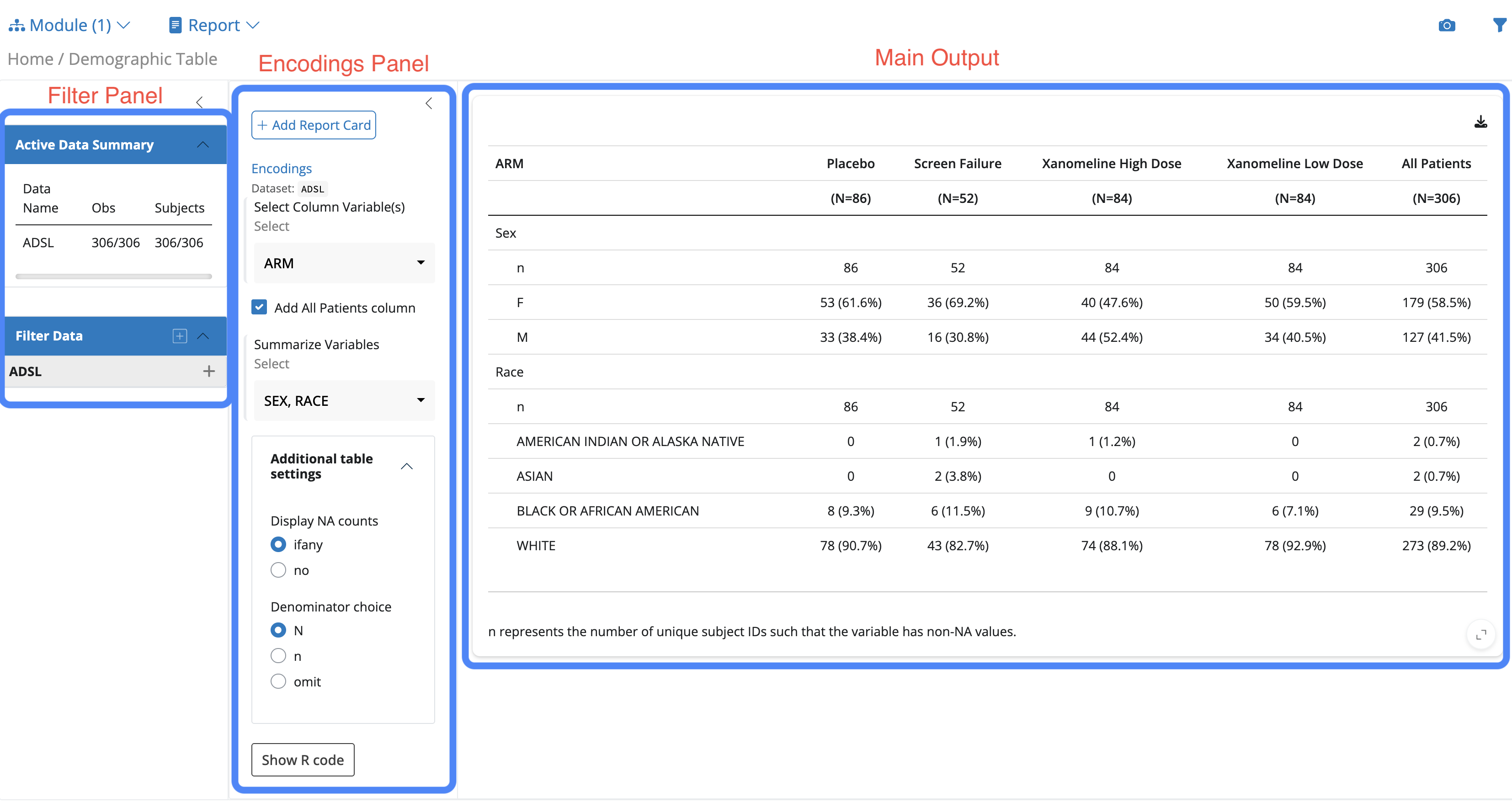 The teal.modules.clinical (TMC) package offers specialized modules designed specifically for clinical trial data analysis. These modules are built on top of teal.modules.general and provide clinical-specific functionality and workflows.